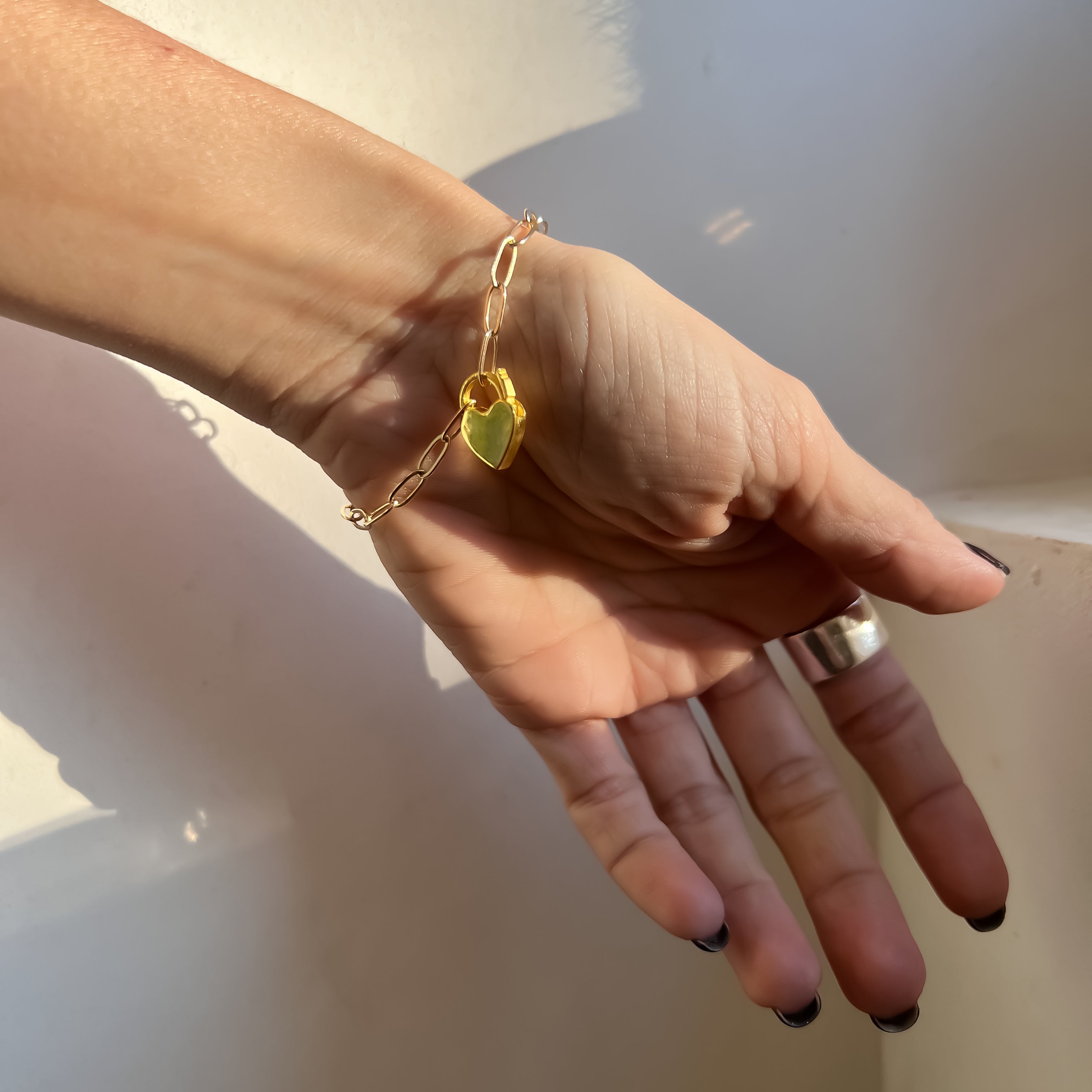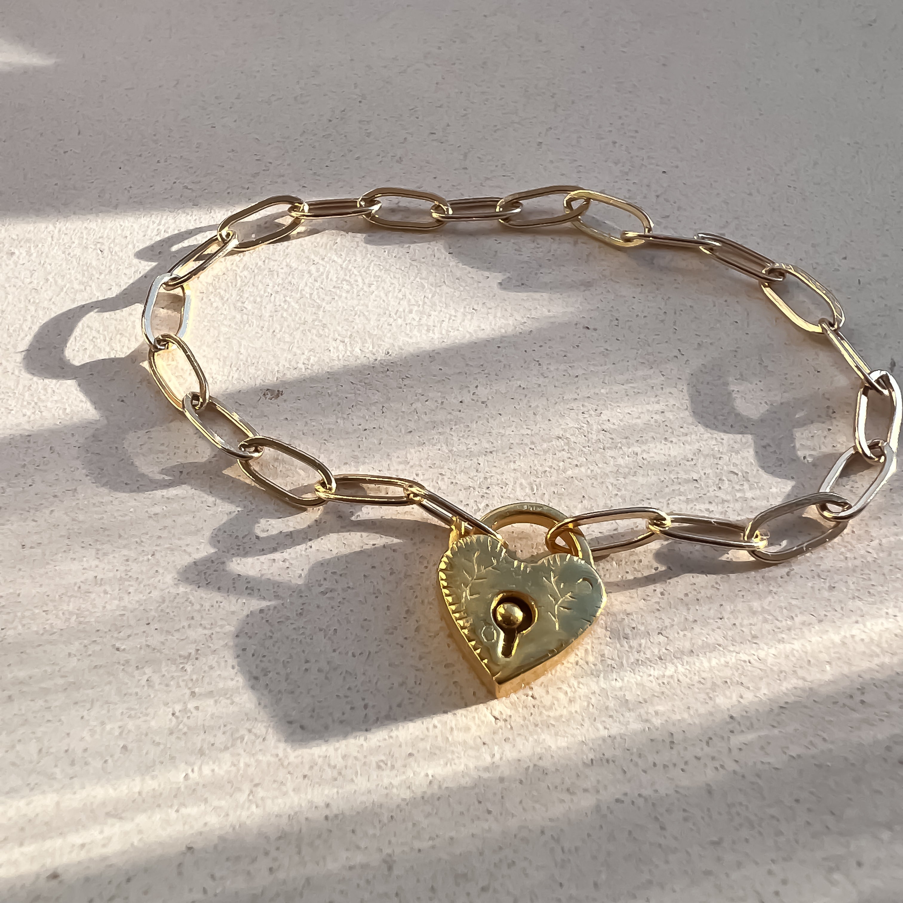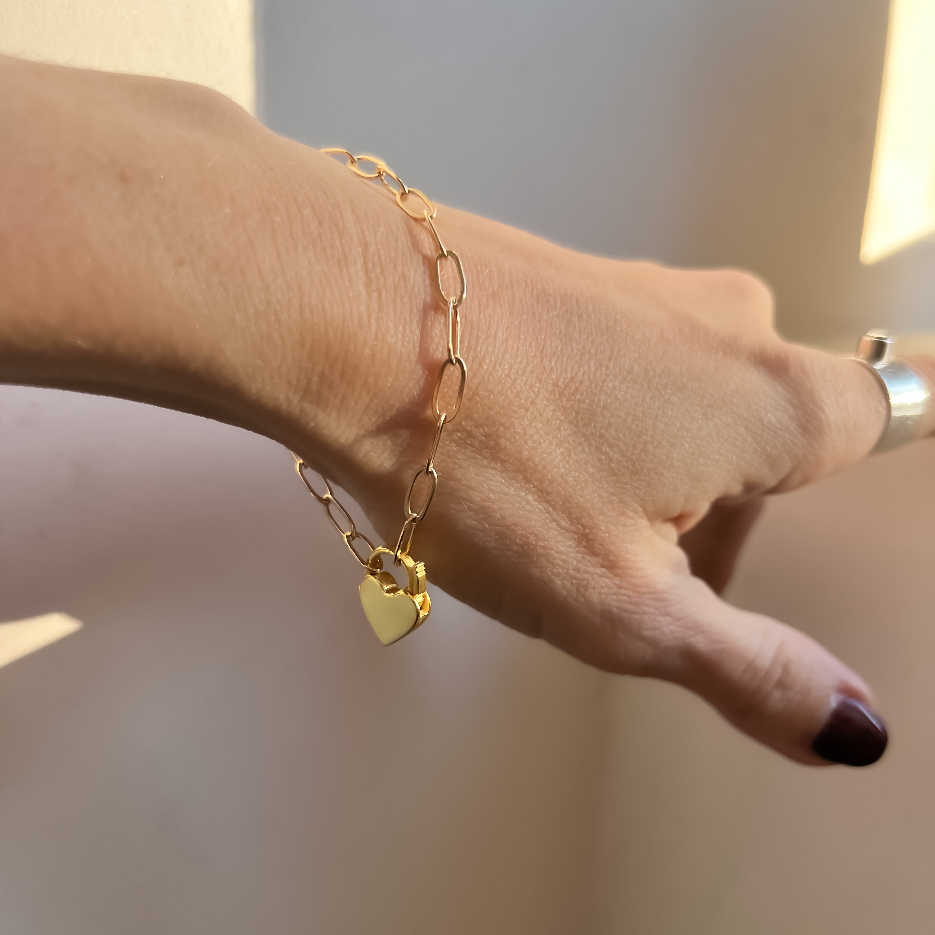 This must-have Gold Heart Bracelet features a chunky chain and a beautiful heart locket, making it a stunning addition to any jewellery collection.