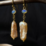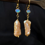 Meet our one off a kind Sacred Opal Drop Earrings with Peach Freshwater Pearls in 22ct Gold Vermeil.