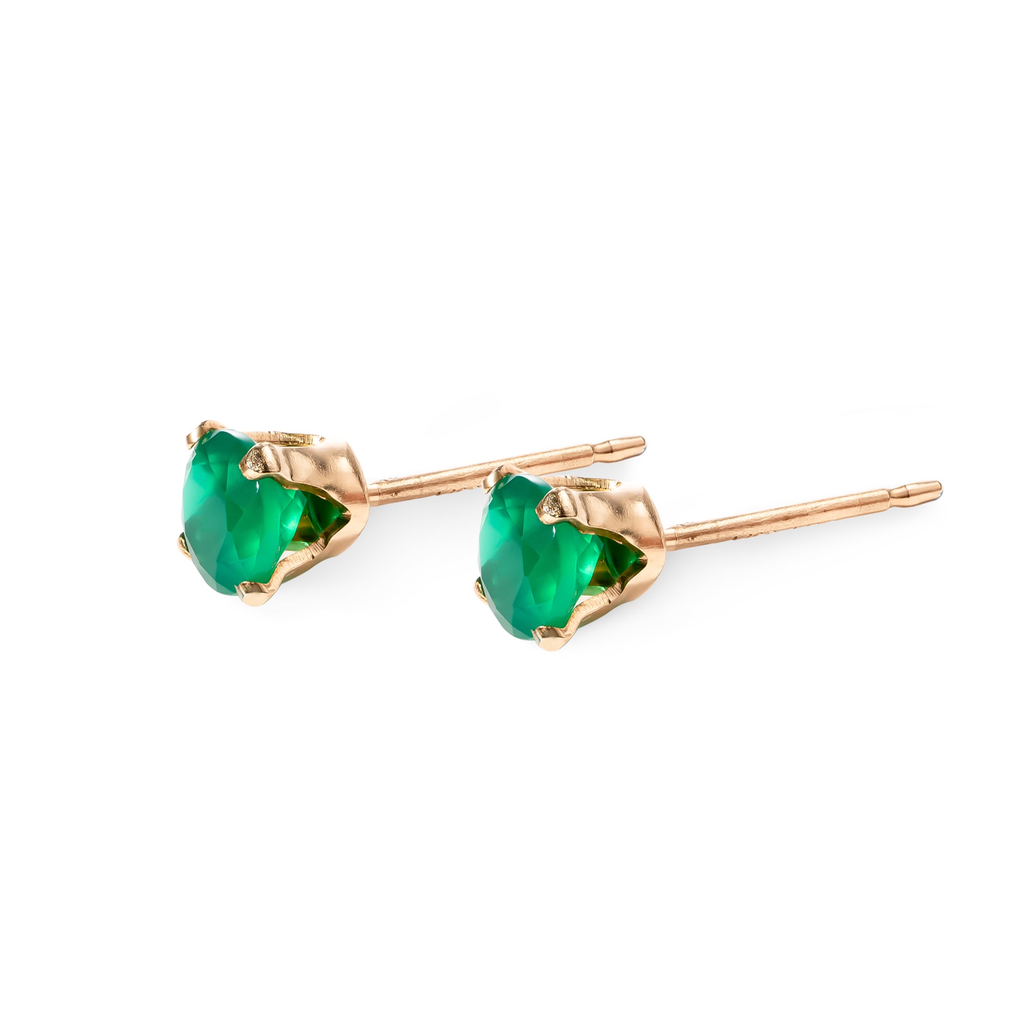Delicate stud earrings featuring genuine green Emerald gemstones in a four prong setting.