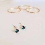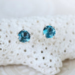 Delicate stud earrings featuring genuine London Blue Topaz gemstones in a four prong setting.