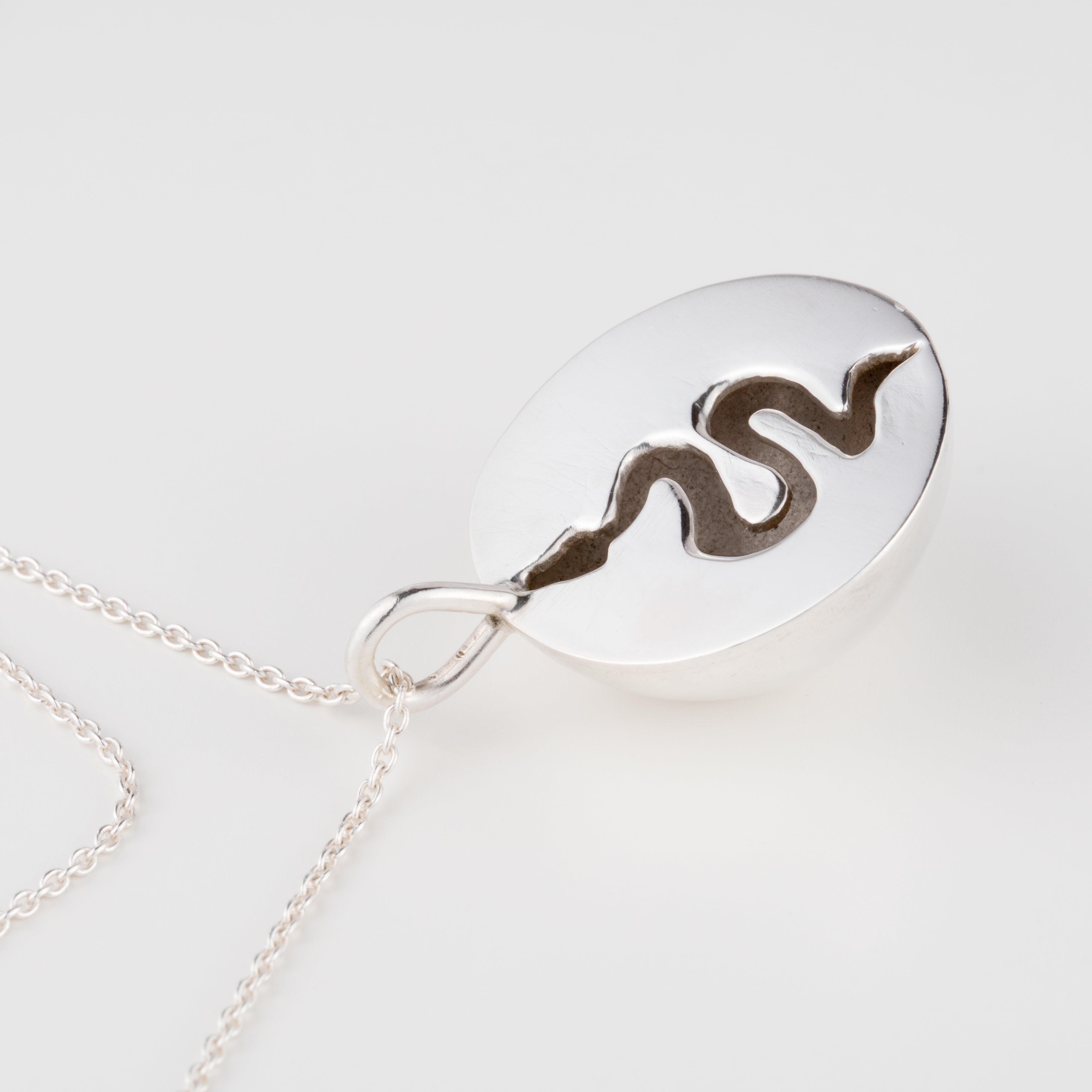 But the real statement is to be found on the back of the pendant. This is where you can find a simple single centre dot design, a climbing serpent design, or a design of your own creation!