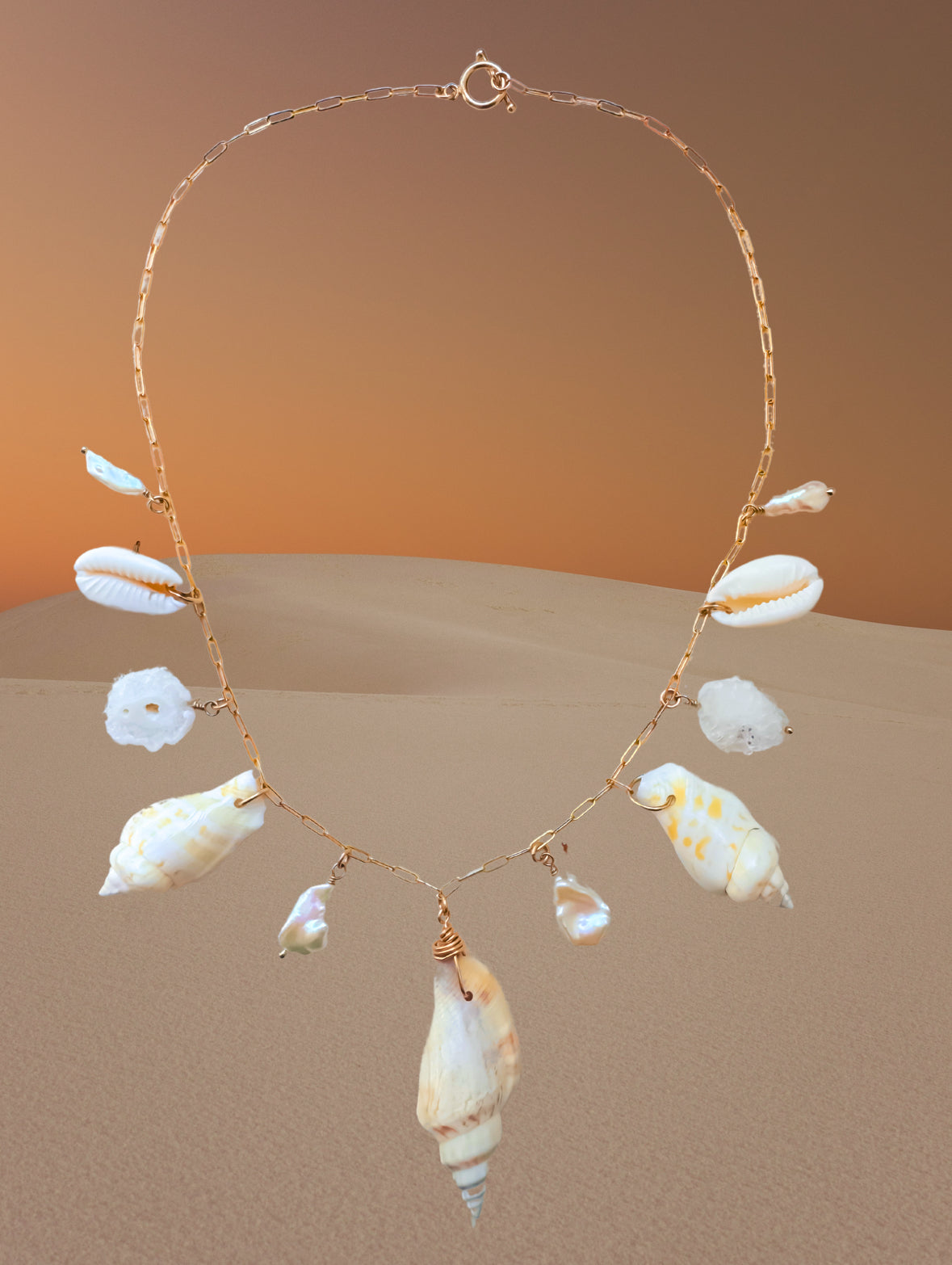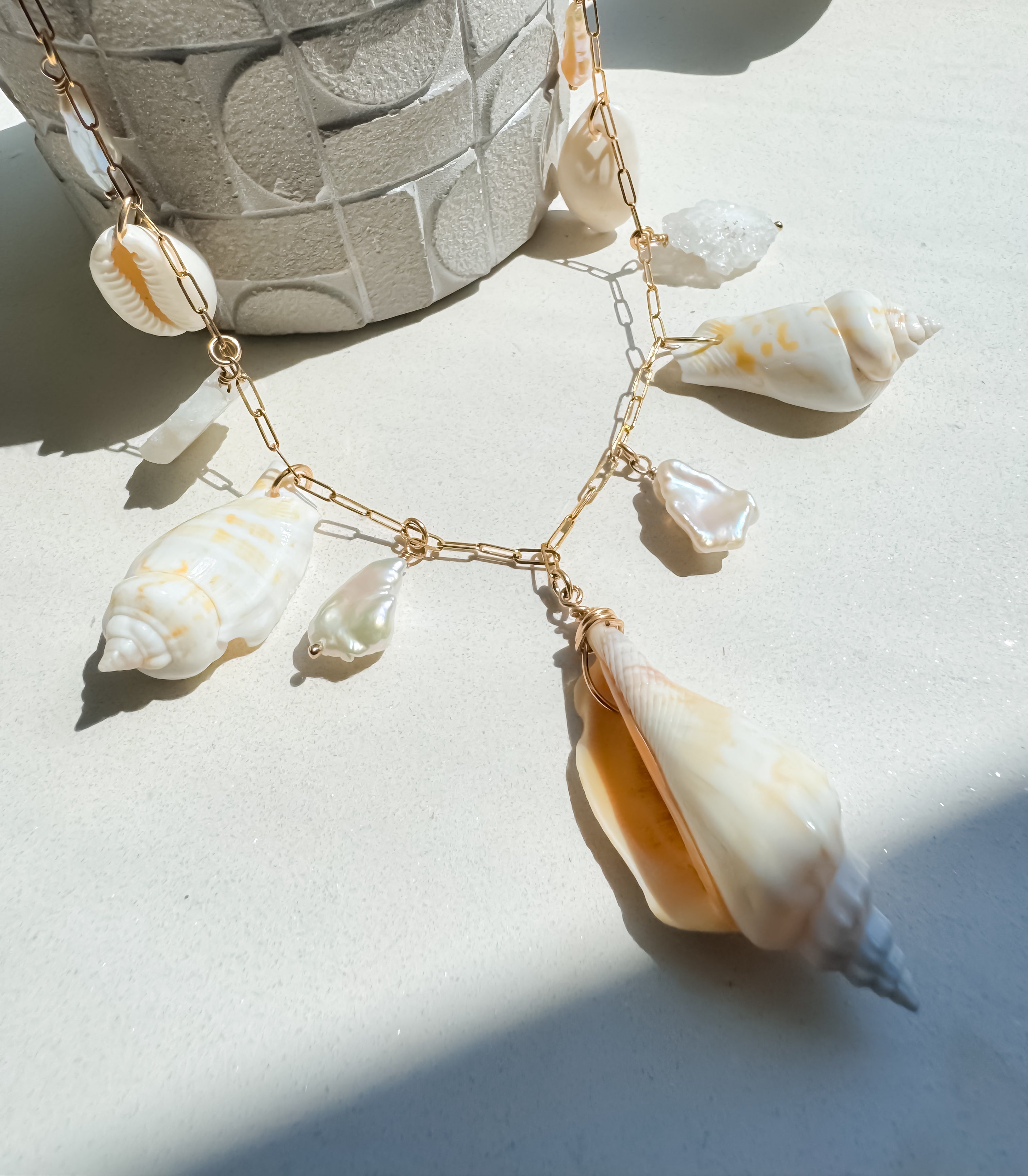 Materials: 14k Gold Filled (waterproof), Freshwater Pearls, Beachcombed Real Organic Shells (origin: Ibiza), Solar Quartz