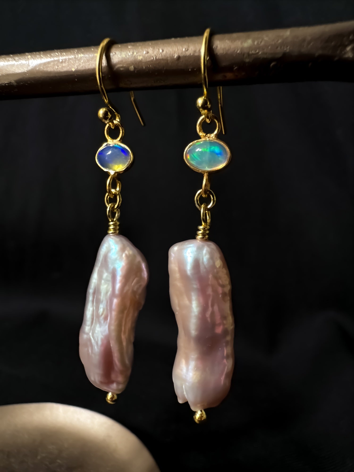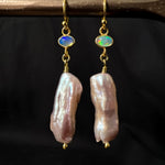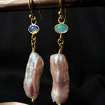 Meet our one off a kind Sacred Opal Drop Earrings with Rose Pink Freshwater Pearls in 22ct Gold Vermeil.