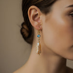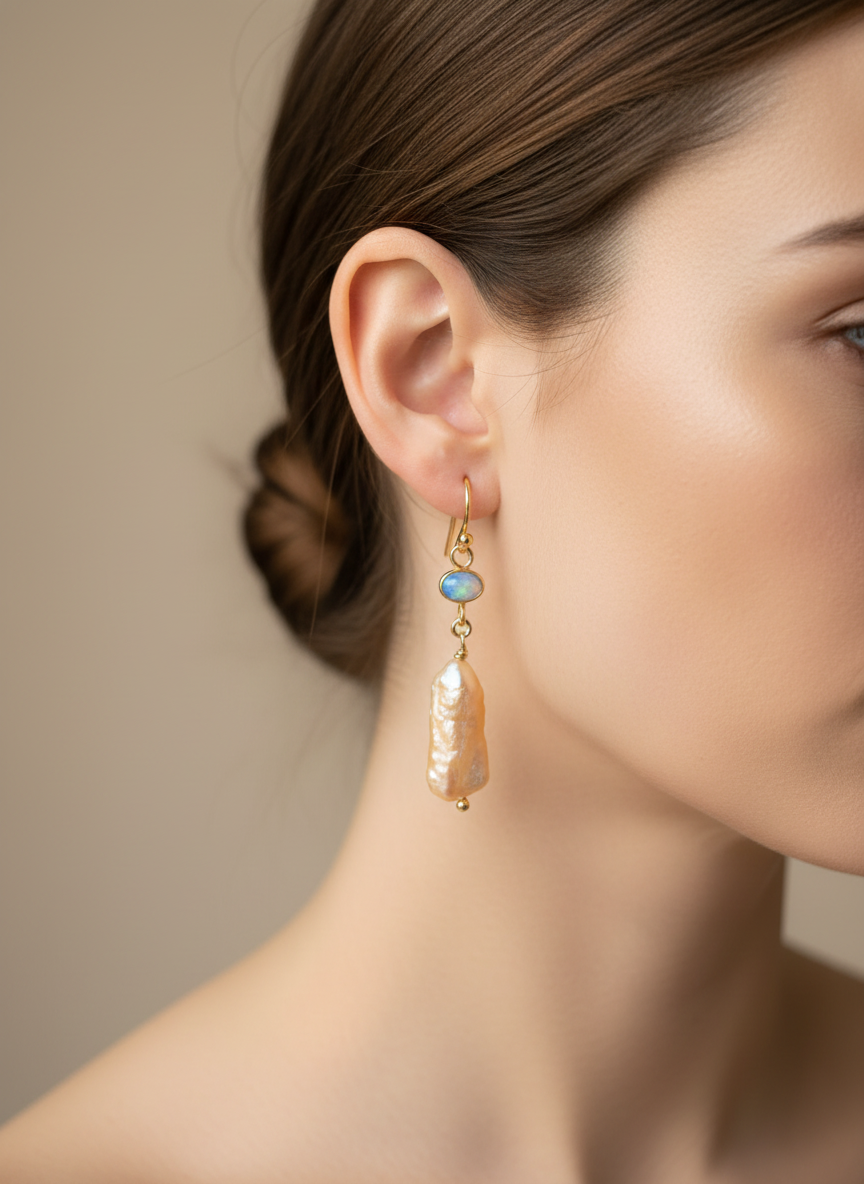 Meet our one off a kind Sacred Opal Drop Earrings with Peach Freshwater Pearls in 22ct Gold Vermeil.
